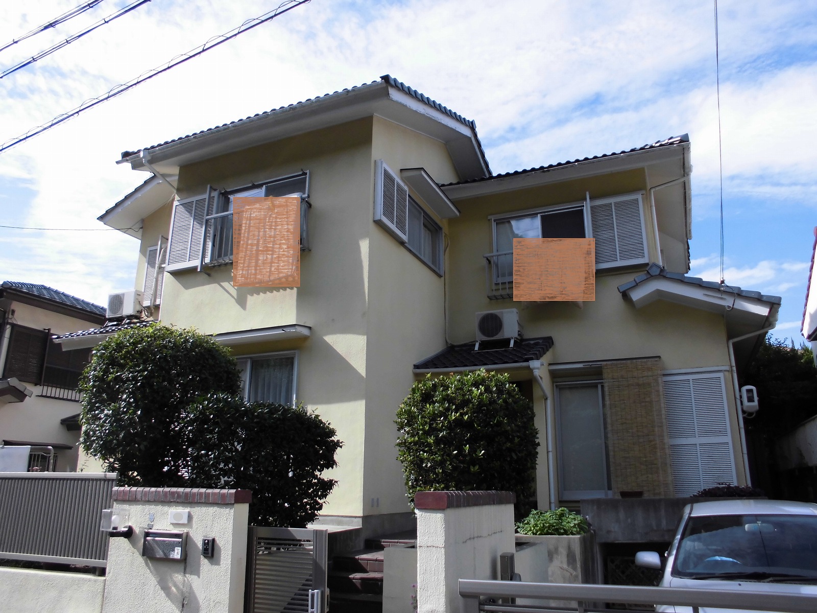 外塀の塗膜の膨れを気にされています。原因は笠木煉瓦の隙間のモルタルが収縮してひび割れを発生して水が浸透しているのと表札や郵便受けの取り付け隙間からの水の侵入も原因の一つとなります。これらの補修も今回の塗装工事に含まれています。