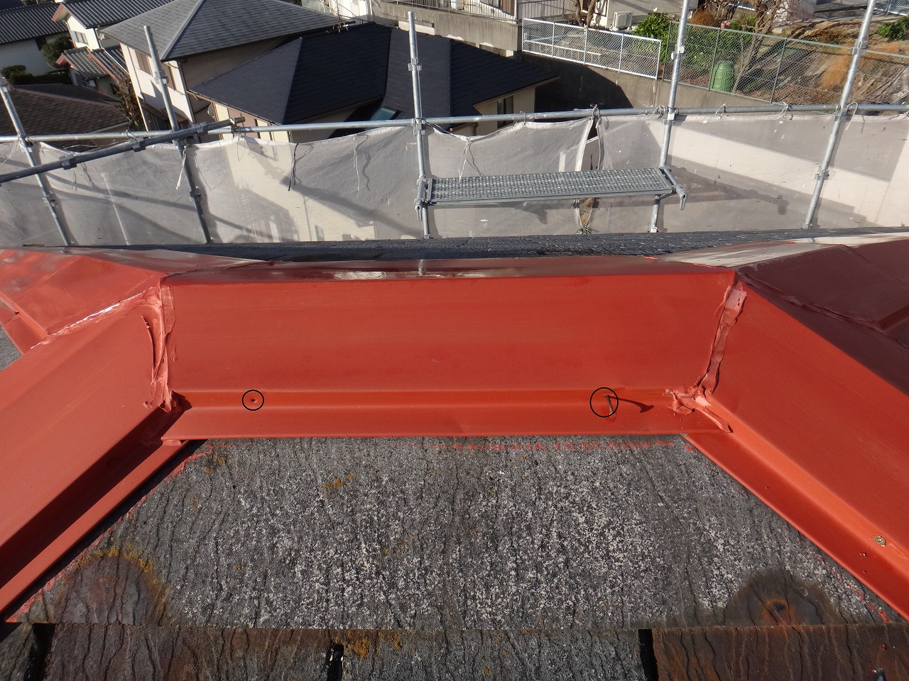 1月19日の作業は屋根の棟押え鉄板補修とコーキング補修。