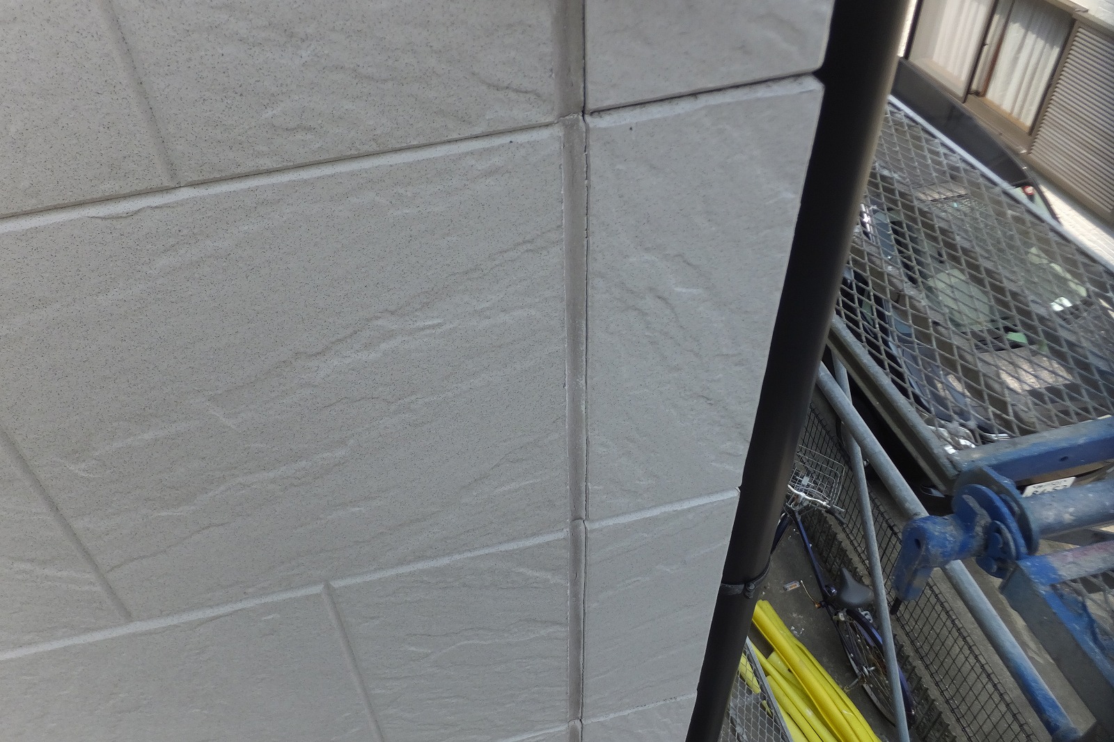 今回の改修は目地のコーキング討ち代えですが左側の壁はお客様自身が補修しようとしてコーキングが目地からはみ出している状態です。 余分にはみ出したコーキングの削り取りも必要になるため余分に手間がかかりそうです。またマスキングテープを張るにしても右側の壁と比べてかなり手間がかかりそうです。