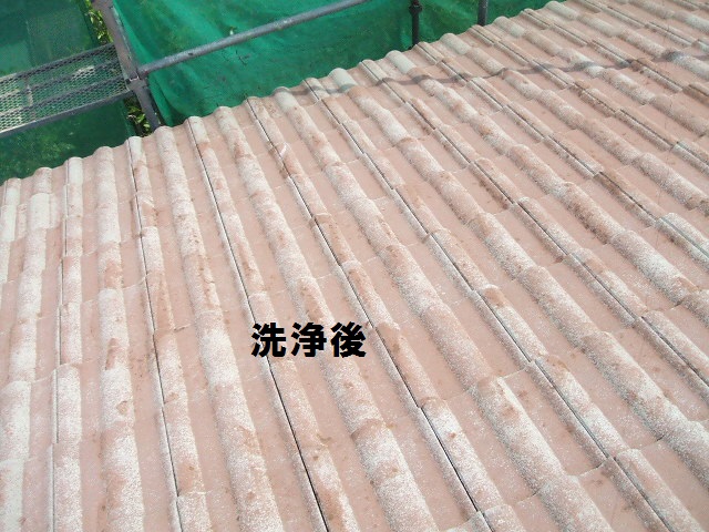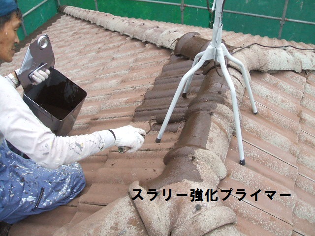 モニエル瓦の塗替えは下塗りの選定に条件がありまして浸透性プライマーで塗装します。高圧洗浄等で付着物や劣化塗膜をしっかり除去するのは共通の工程です。